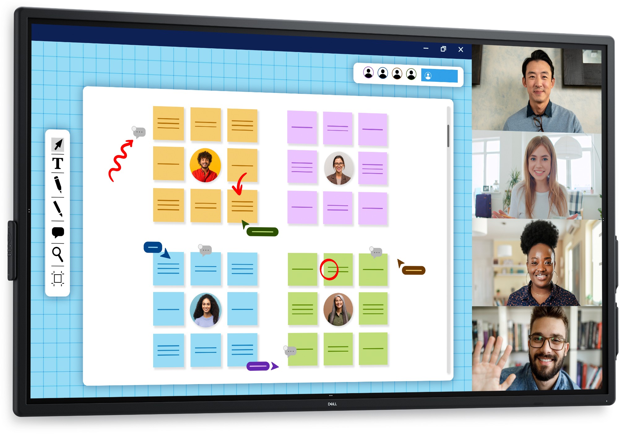 Teamarbeit ohne Leerlauf<br>Dank InGlass™-Touchtechnologie mit 20 Berührungspunkten können mehrere NutzerInnen gleichzeitig mit dem Bildschirm interagieren und ohne Leerlauf nahtlos zusammenarbeiten. Da die Touchfunktion mit den meisten branchenüblichen Softwareanwendungen kompatibel ist, lässt sie sich nahtlos in Ihre bisherige Arbeitsweise integrieren.<br>Natürliches Schreiben<br>Die Handballenerkennung ermöglicht es NutzerInnen, die Hände bequem auf dem Bildschirm abzulegen, ohne dass unerwünschte Aktionen durchgeführt werden. Der Stift mit zwei Spitzen ist jetzt einem natürlicheren Schreibwerkzug nachempfunden und bietet ein ergonomisches, griffiges Design, eine feine Schreibspitze und einen präzisen Radierer. Er lässt sich magnetisch an der Seite des Displays befestigen und ist so stets griffbereit.<br>Integrativ für alle<br>Die einzigartige Dell Screen-Drop-Funktion ist die weltweit erste Funktion zur Verbesserung der Barrierefreiheit und hilft Nutzern, den Bildschirm in verschiedenen Höhen zu erreichen.<br>Zusammenarbeit im Handumdrehen<br>Erleben Sie die intuitive Touchtechnologie, mit der Sie durch Fingerbewegungen Anmerkungen hinzufügen und mit Ihrem Handballen löschen können.
