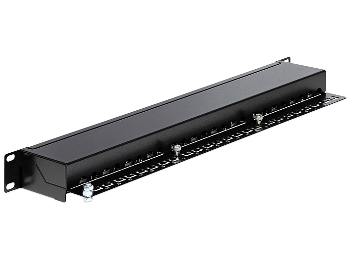 Dieses Patchpanel von Delock können Sie zum Einbau in einen 19" Geräteschrank verwenden. An den LSA-Leisten können Sie mit einem Auflegewerkzeug bis zu 24 Netzwerkkabel installieren.