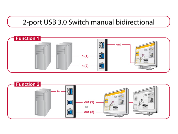 Nutzen Sie den Delock USB 3.0 Umschalter, um von zwei verschiedenen Computern auf ein USB Gerät (Funktion 1) oder von einem Computer auf zwei USB Geräte (Funktion 2) zuzugreifen. Sie können z. B. eine Festplatte, Drucker, Scanner etc. an den Umschalter anschließen.