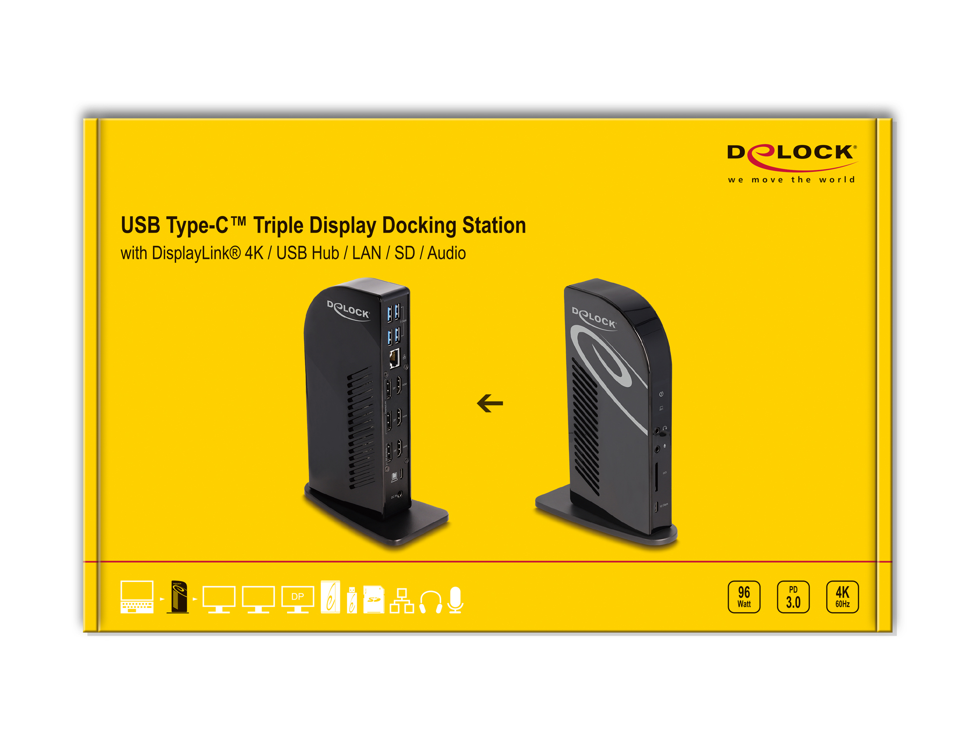 DeLOCK USB Type-C Triple Display Dockingstation mit DisplayLink® 4K / USB Hub / LAN / SD / Audio / PD 96 W