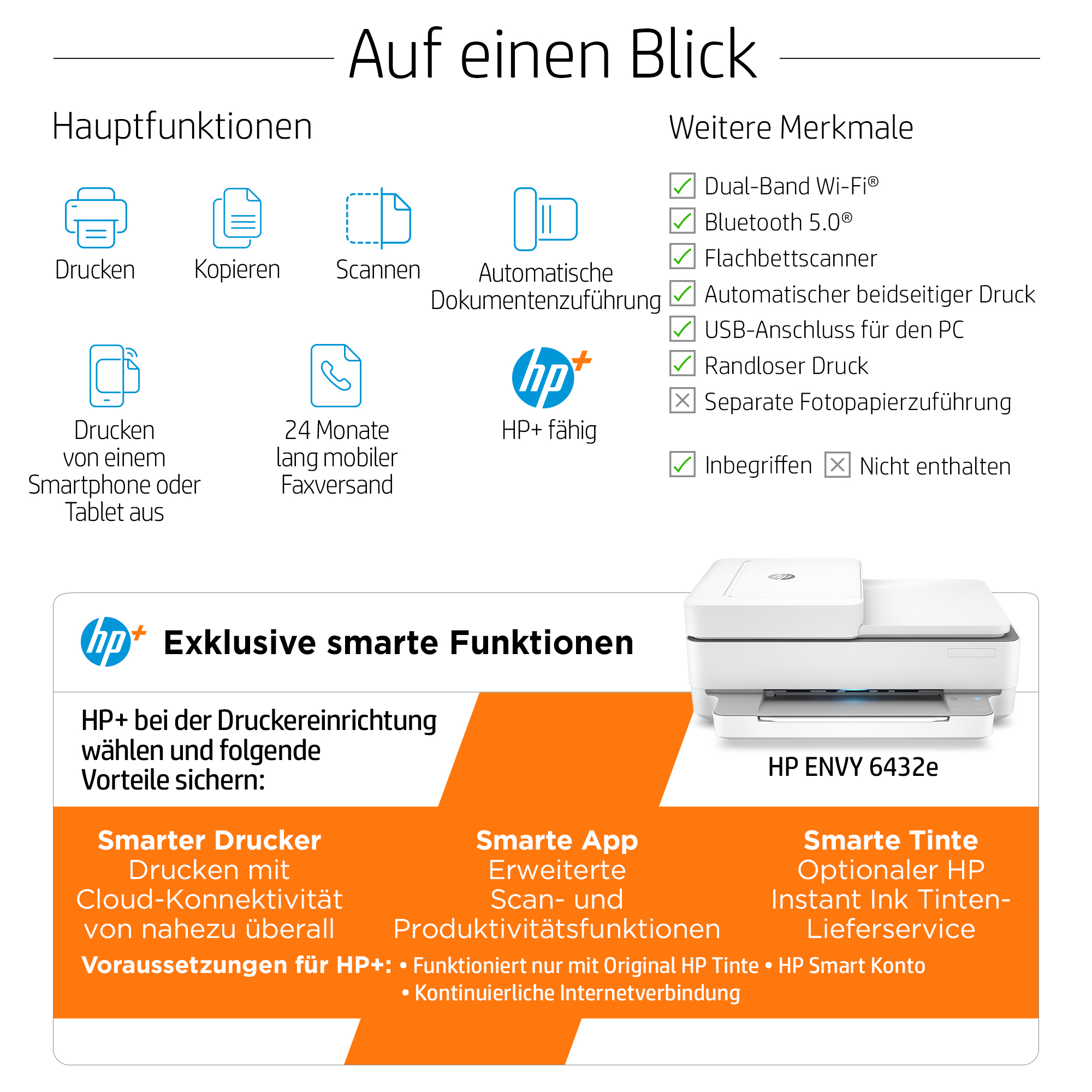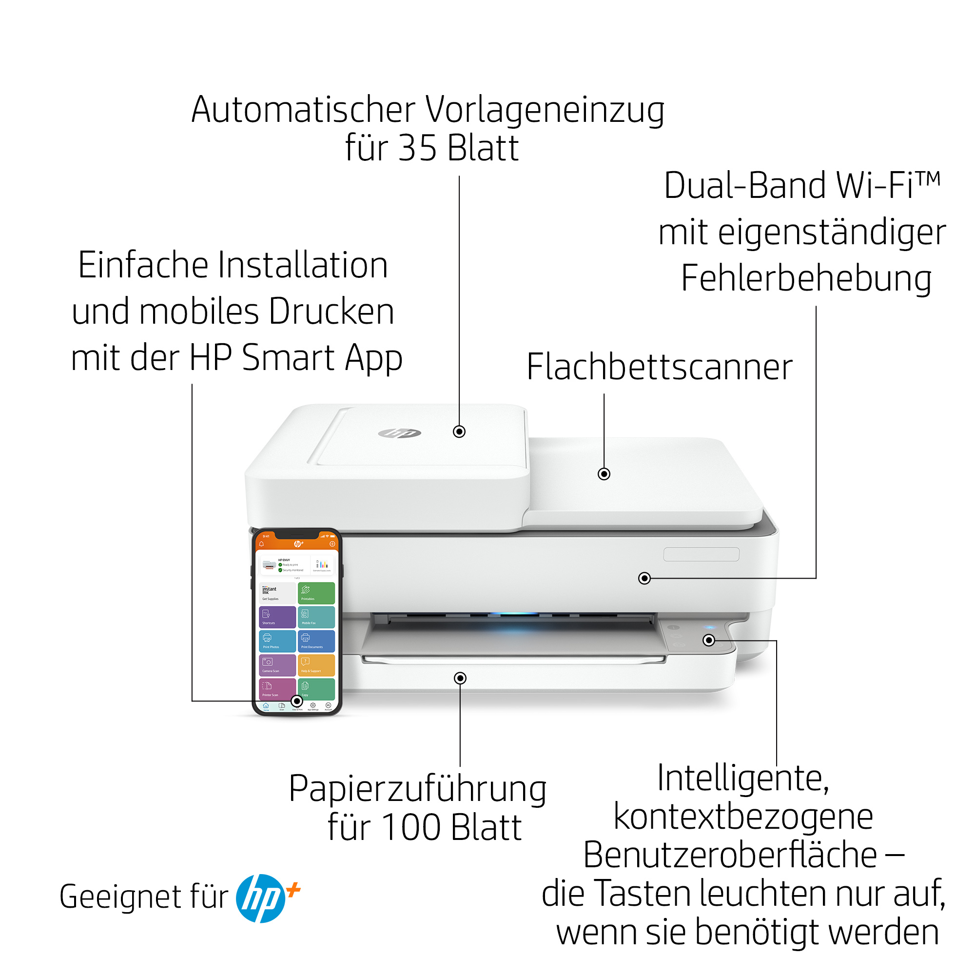 Dies ist ein HP+ fähiger Drucker. Wählen Sie bei der Produkteinrichtung HP+, um von den Vorteilen zu profitieren. HP+ erfordert ein HP Konto, eine unterbrechungsfreie Internetverbindung und die ausschließliche Verwendung von Original HP Druckerpatronen während der gesamten Lebensdauer des Druckers. Mehr Information unter: http://www.hp.com/plus