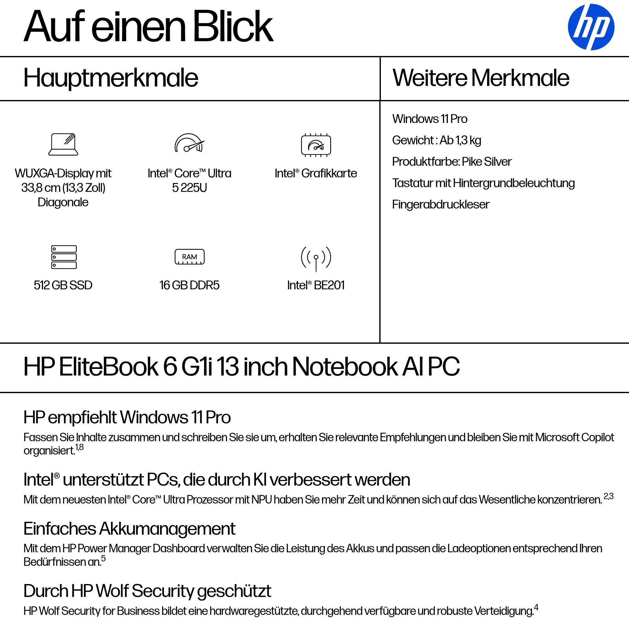 HP EliteBook 6 G1i AI PC Intel Core Ultra 5 225U Laptop 33,8 cm (13.3") WUXGA 16 GB DDR5-SDRAM 512 GB SSD Wi-Fi 7 (802.11be) Windows 11 Pro Silber