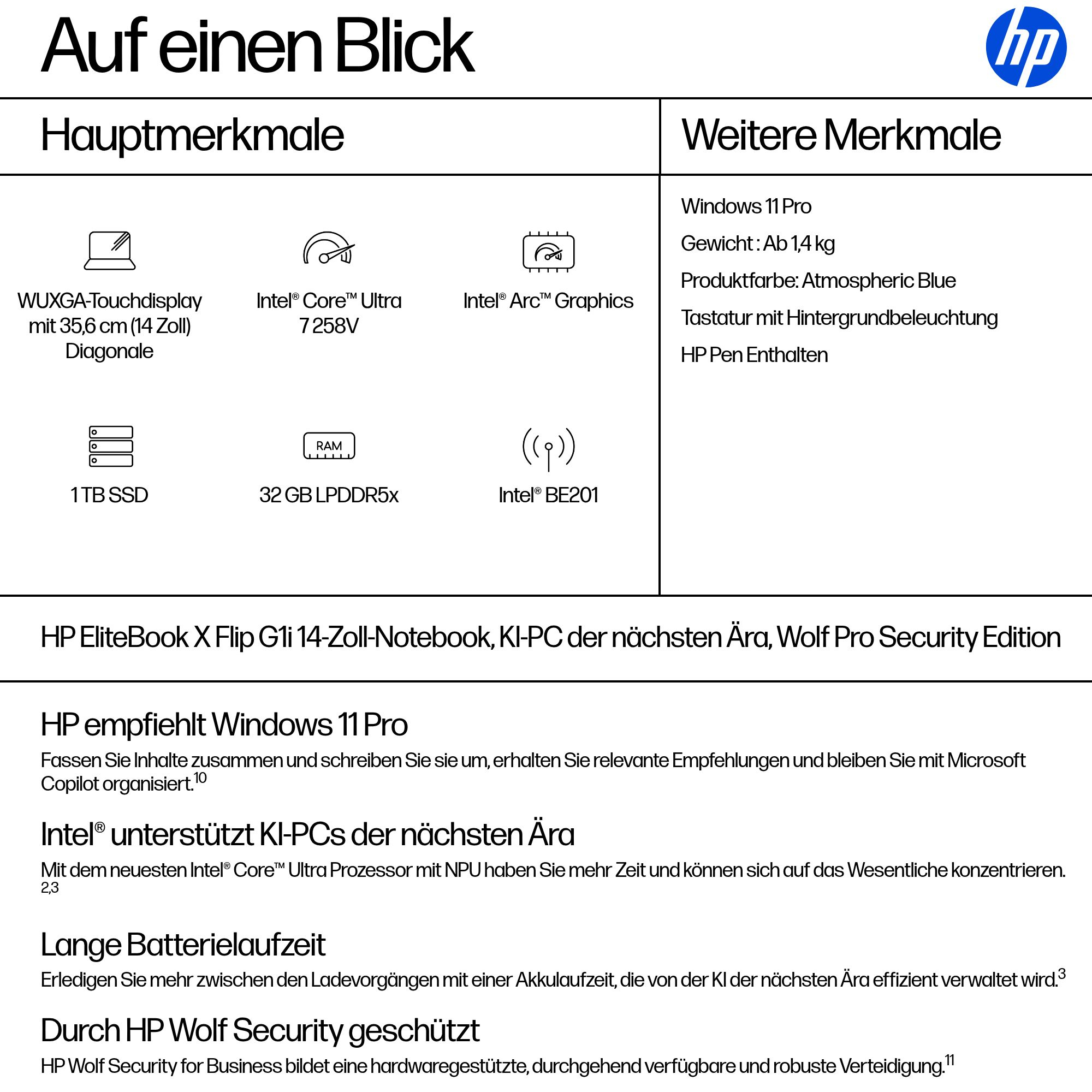 HP EliteBook X Flip G1i Next Gen AI PC Wolf Pro Security Edition Copilot+ PC Intel Core Ultra 7 258V Hybrid (2-in-1) 35,6 cm (14") Touchscreen WUXGA 32 GB LPDDR5x-SDRAM 1 TB SSD Wi-Fi 7 (802.11be) Windows 11 Pro Blau