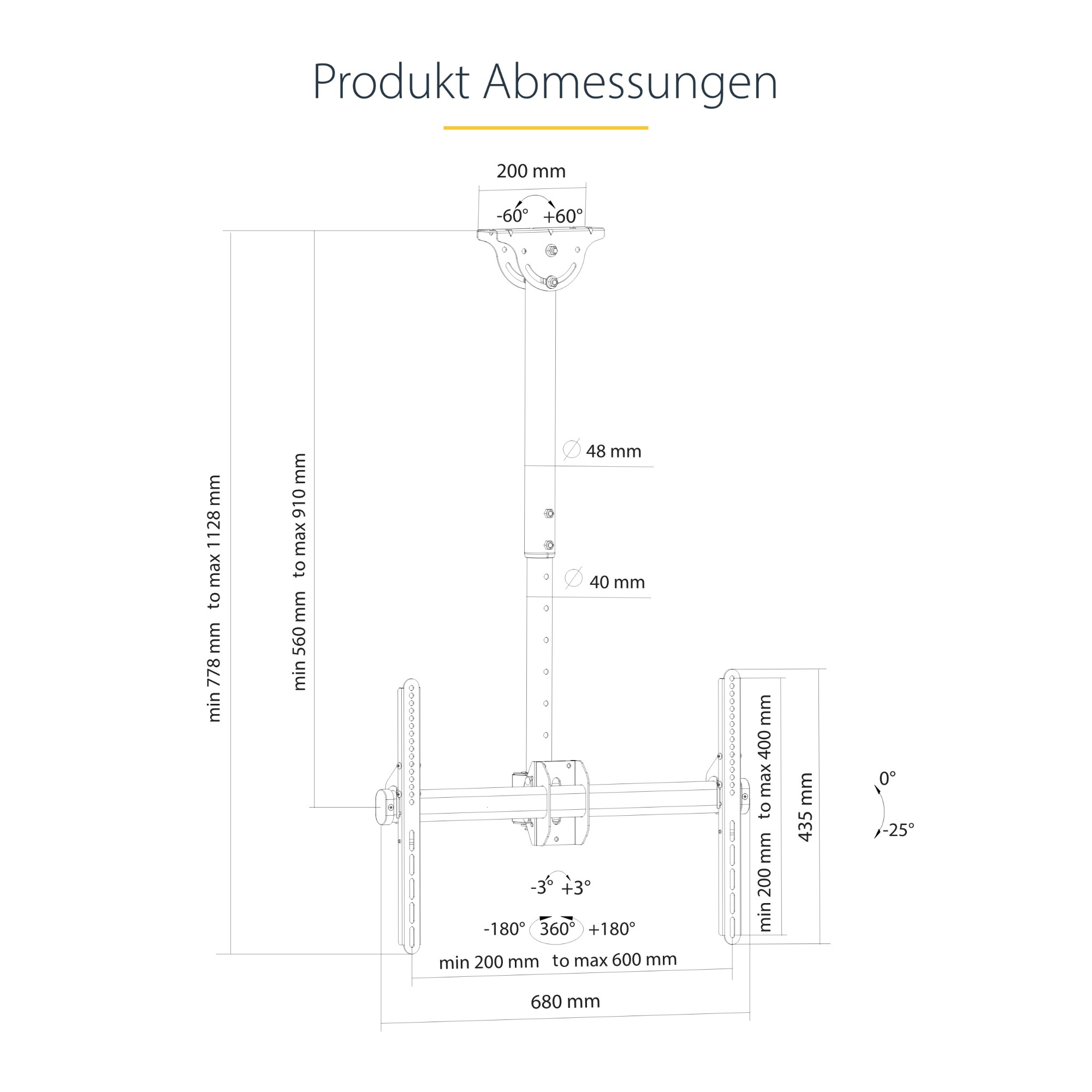 Der Fernseher lässt sich mithilfe einer Stange im Teleskop-Stil im gewünschten Abstand von der Decke anbringen. Geeignet für verschiedene Deckenhöhen. Die Stahlstange kann von 560 auf maximal 910 mm verlängert werden und bietet einen Gesamthöhenunterschied von 350 mm.