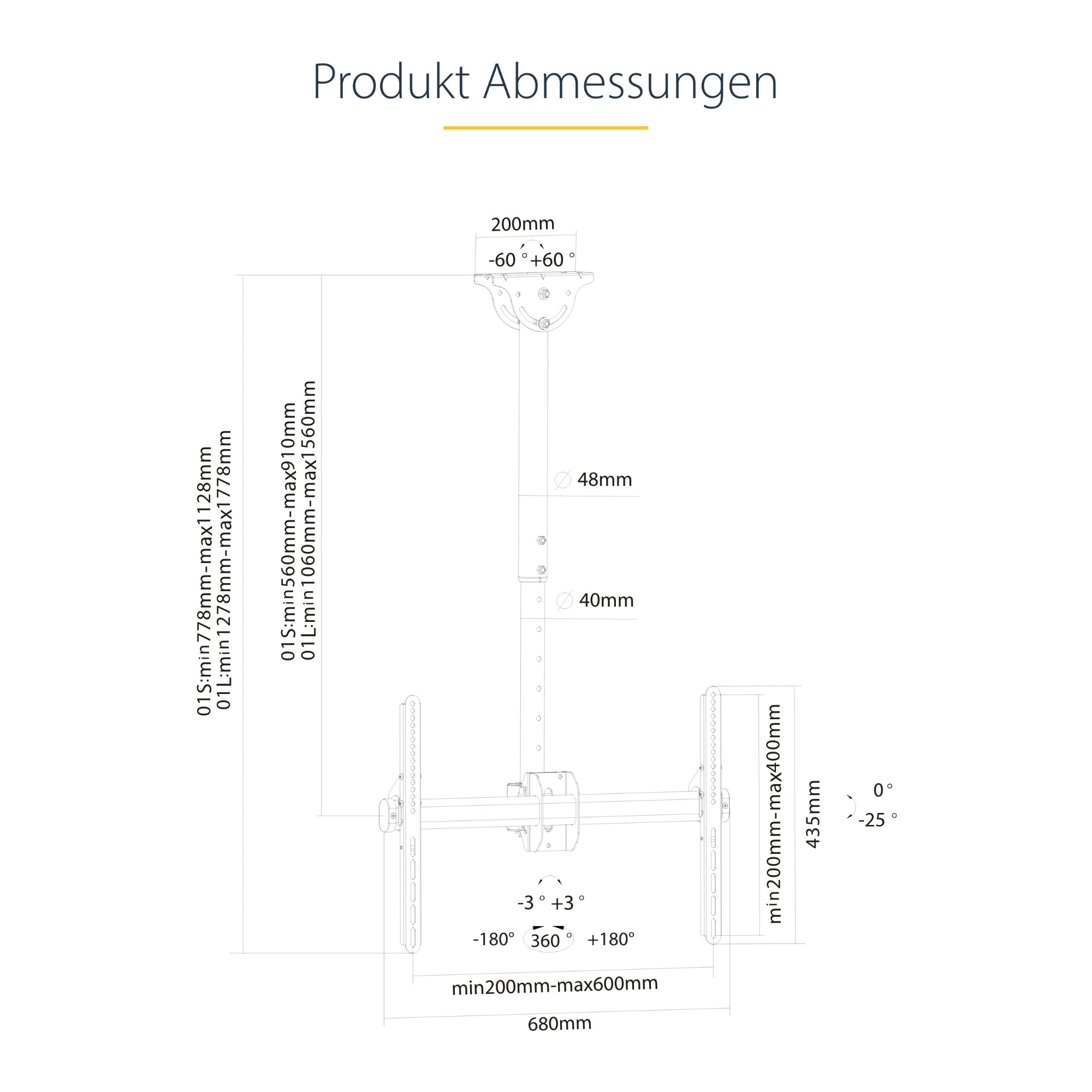 Der Fernseher lässt sich mithilfe einer Stange im Teleskop-Stil im gewünschten Abstand von der Decke anbringen. Geeignet für verschiedene Deckenhöhen. Die Stahlstange kann von 1060 auf maximal 1560 mm verlängert werden und bietet einen Gesamthöhenunterschied von 0,5 m.