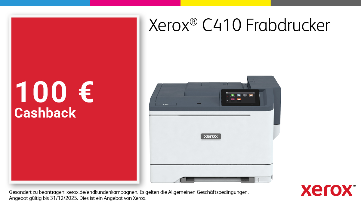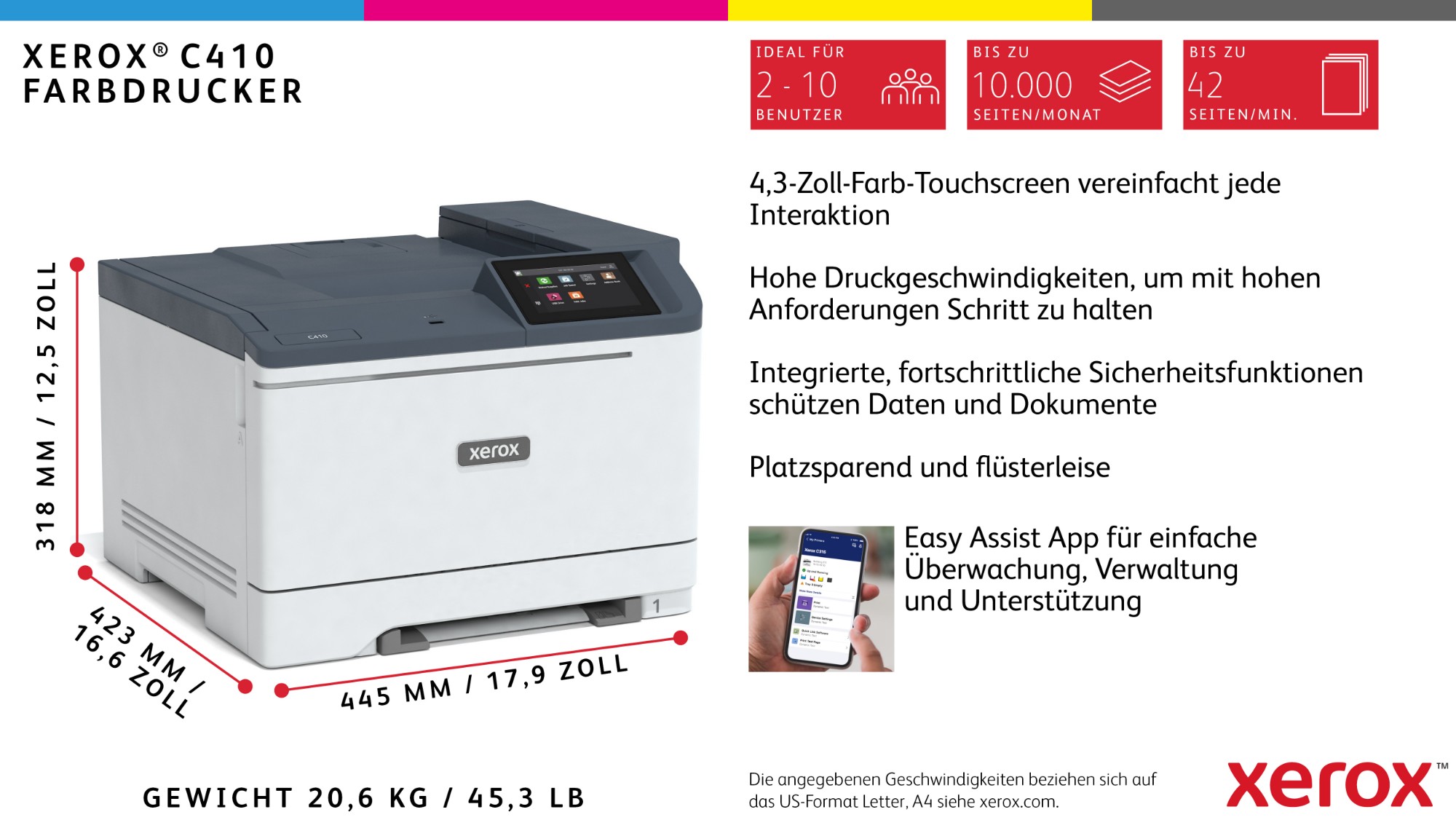 Einfach, zuverlässig und sicher. Sie möchten reibungslos drucken? Der Xerox® C410-Farbdrucker hat alles, was Sie brauchen, um ihr Arbeitspensum schneller zu bewältigen – perfekt abgestimmter Funktionsumfang, schnelle Druckgeschwindigkeit, erstklassige Farbergebnisse und optionales WLAN. Kinderleichte Installation. Der sofort einsatzbereite C410-Drucker eignet sich perfekt für Arbeitsteams kleiner bis mittlerer Größe, die einen flexiblen Drucker benötigen. Die Xerox® Easy Assist App führt Sie bequem über Ihr Smartphone durch die WLAN-Einrichtung. Dadurch können Sie nach nur wenigen Minuten und mit minimalem IT-Support nahezu unterbrechungsfrei Ihrem Arbeitsalltag nachgehen.