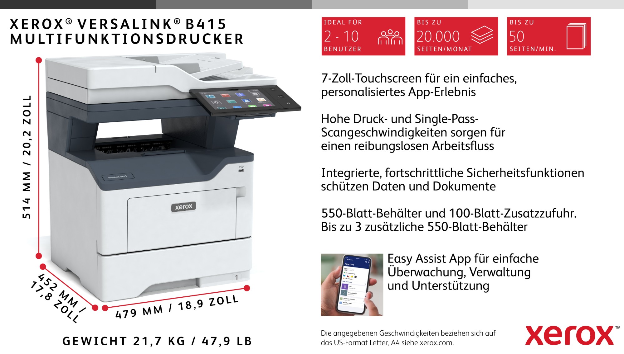 Xerox VersaLink B415 A4 47 S./Min. 2-seitig Kopieren/Drucken/Scannen/Faxen PS3 PCL5e/6 2 Behälter Gesamt 650 Blatt
