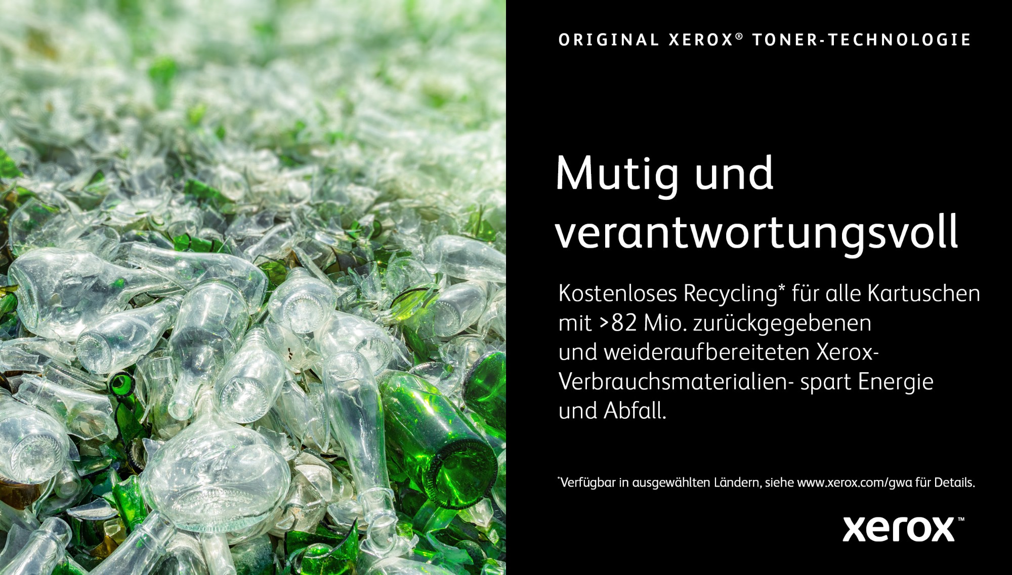 Kostenloses Recycling* für alle Kartuschen mit >82 Mio. zurückgegebenen und weideraufbereiteten Xerox-Verbrauchsmaterialien- spart Energie und Abfall.<br><br>* Verfügbar in ausgewählten Ländern, siehe www.xerox.com/gwa für Details.
